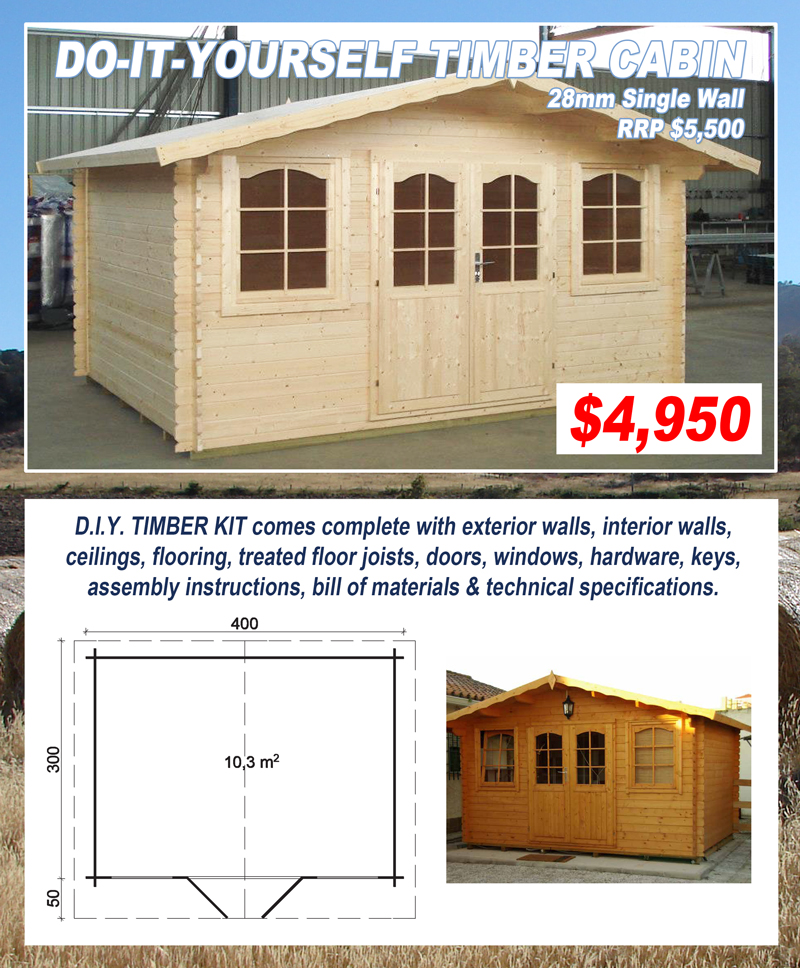 Do-It-Yourself The timber log cabins & structures are stylish, affordable & supplied in easy to assemble do-it-yourself kits making them ideal for the owner builder. All kits come complete with exterior walls, pre-assembled gable ends, interior walls, ceilings, flooring, treated floor joists, doors, windows, hardware, keys & assembly instructions. The buildings are designed & manufactured with a focus on high quality product & simple construction. They slot together easily with interlocking joints & corners ensuring an airtight & weatherproof structure. They are manufactured from kiln dried spruce which is well known for its consistent qualities. The timber is strong, durable, resistant to splitting & considered one of the most stable woods for log construction. The timber is sourced from ecologically managed, sustainable regrowth forests, minimising the damage caused to our environment. The log cabins & structures are an environmentally friendly & energy efficient solution providing a pre-sanded smooth interior & exterior finish. Once assembled, the buildings are ready for the timber finish & roofing of your choice. IN STOCK NOW The DIY timber kits we currently have in stock can also be viewed on our Gumtree page. |